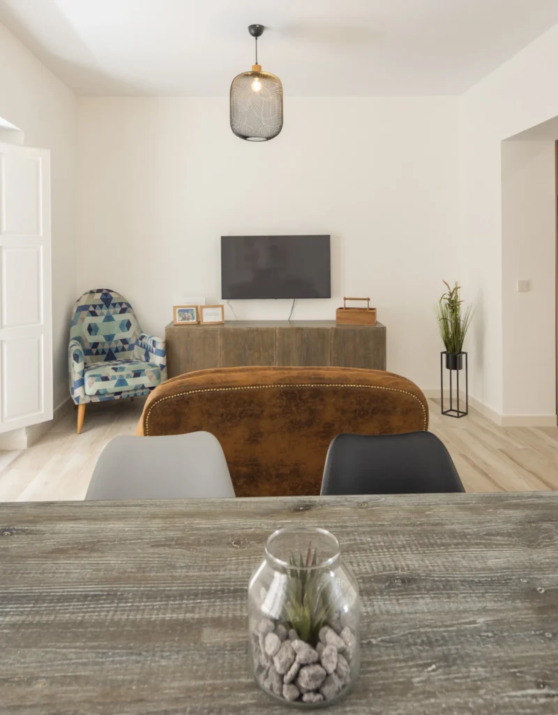 Diseñado para alquiler vacacional en Cádiz, tiene una amplia sala de estar y comedor, con una decoración acogedora y moderna, perfecta para relajarse y descansar.